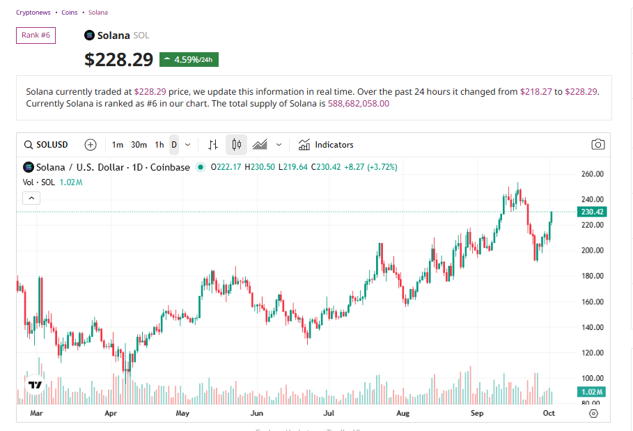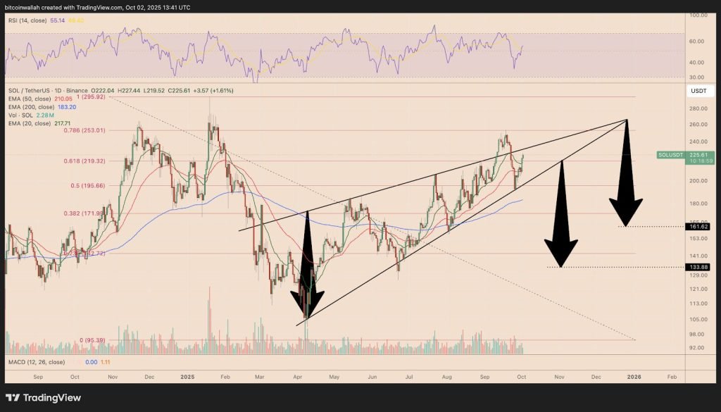 Solana’s price has already gained 9% in October, reaching $227.50. Technical charts show a rising wedge pattern that could indicate either a breakout toward $300 or a 30% downside risk if the formation reverses.